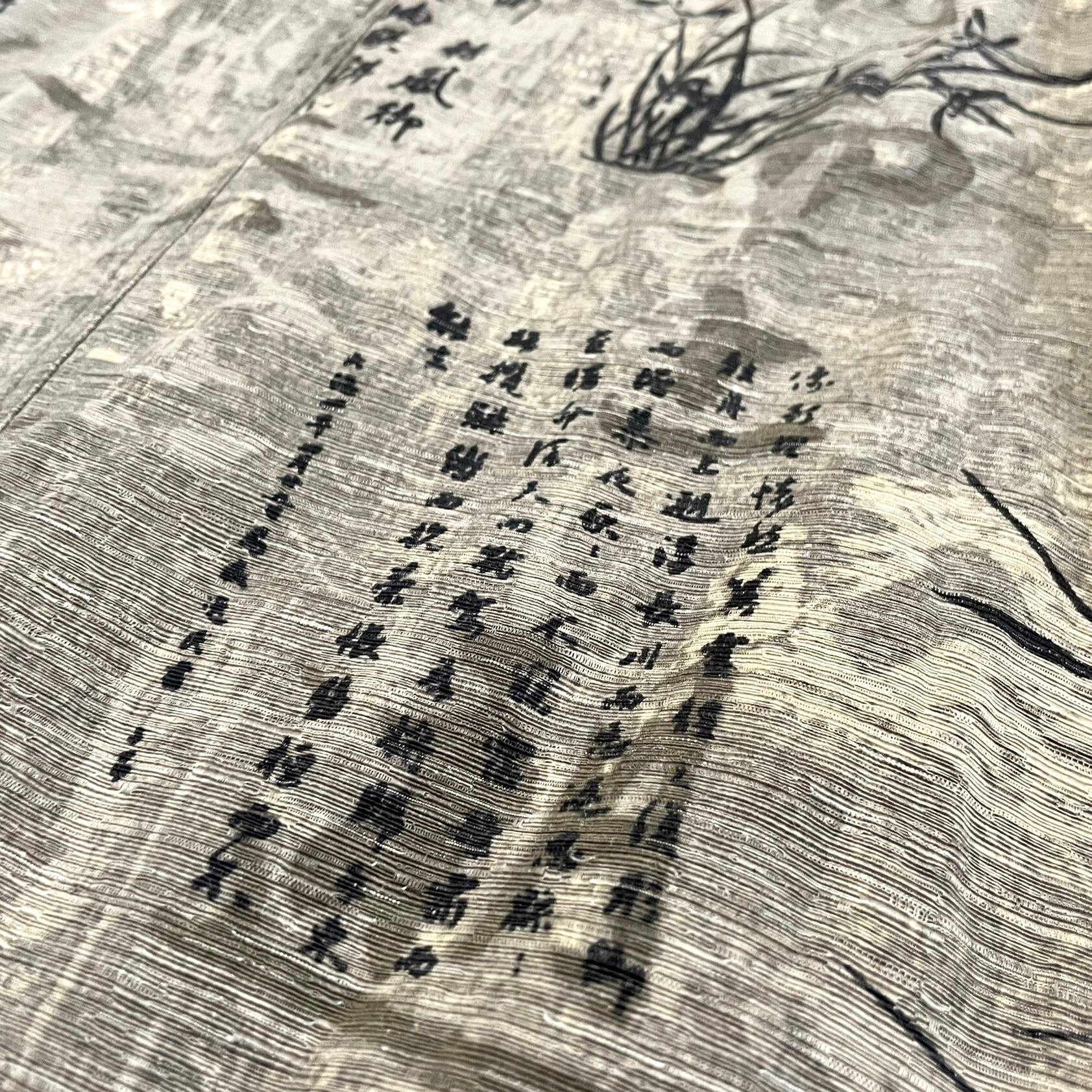 竹を彷彿とさせる独特な生地に漢文や草木を掛軸のように総柄としてあしらった渋いデザイン。