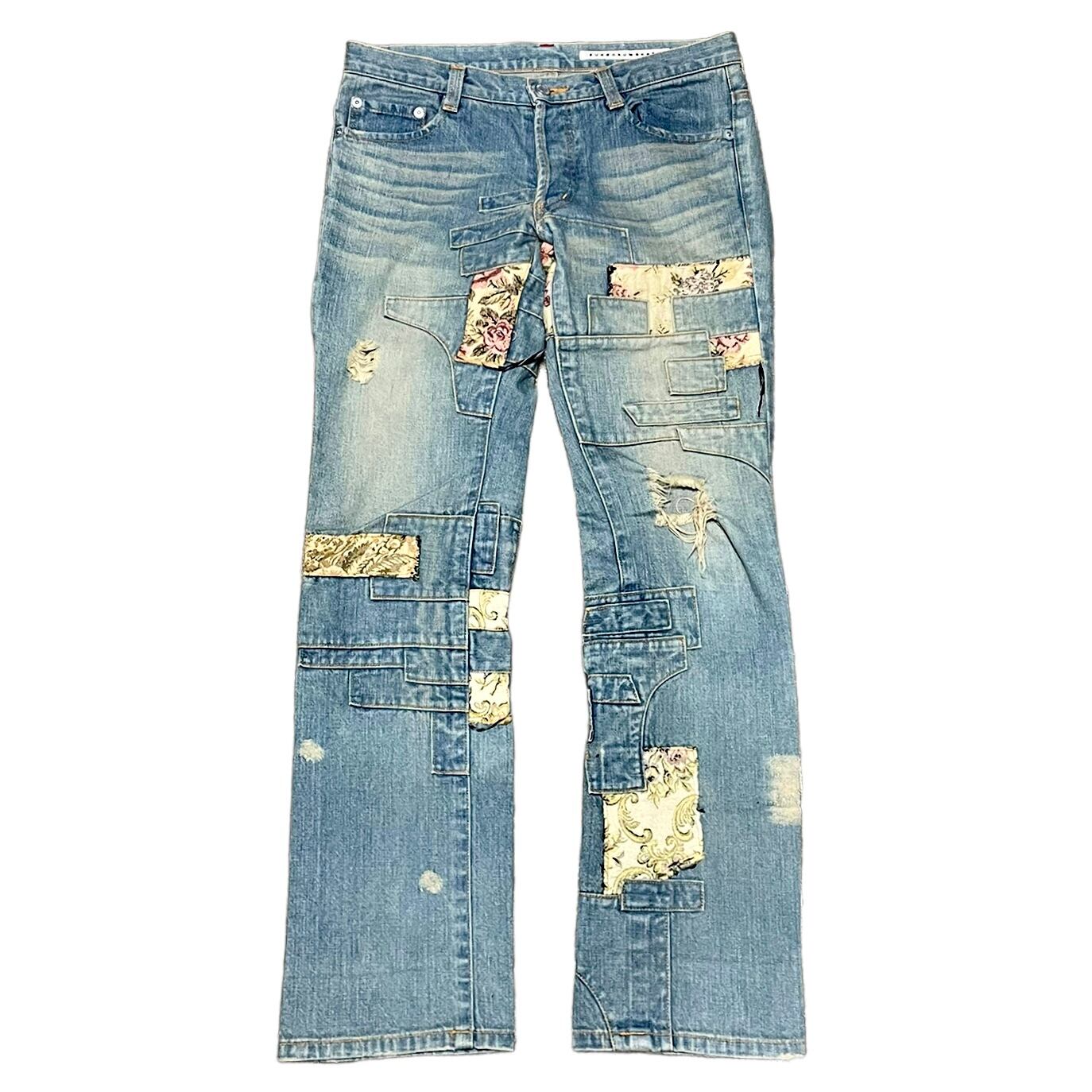 メイン生地とゴブランを随所に継ぎ接ぎし、ダメージ加工が施されたデニムパンツ。