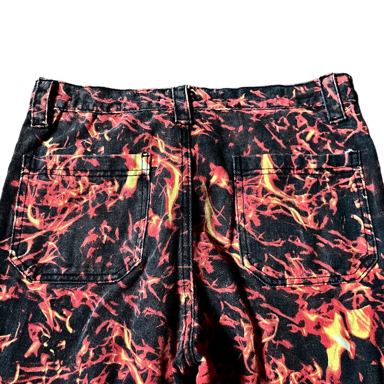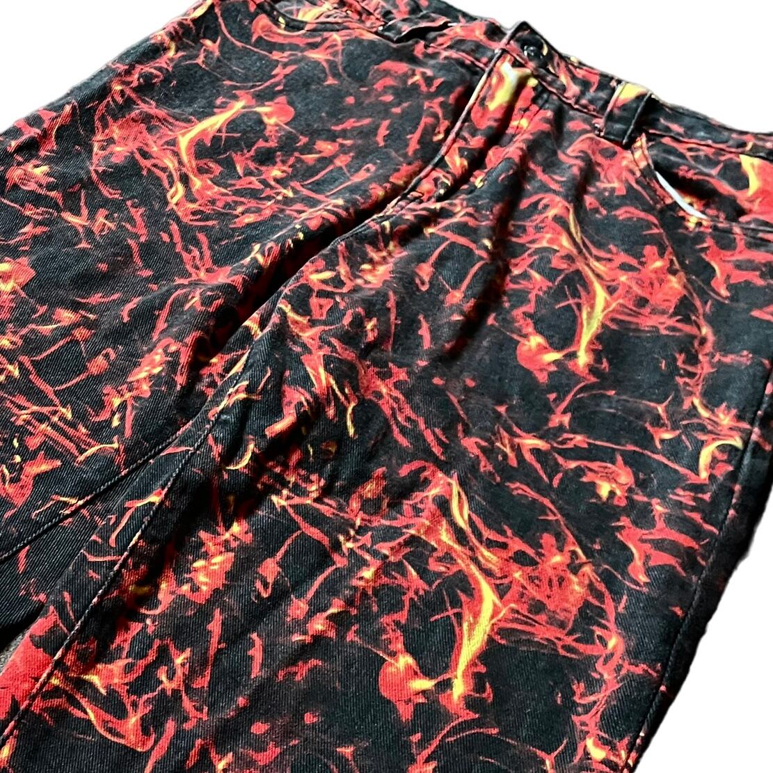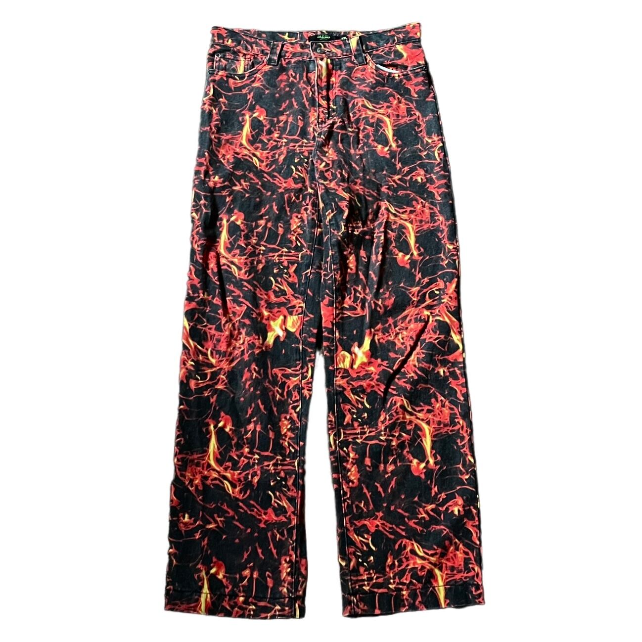 全面にファイヤーパターンのプリントが入ったインパクトの強いパンツ。
